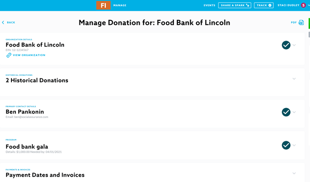 - Once the donation record is open you will be able to review and access the donation information. The information details can be expanded for full details by clicking on the arrow to the right of the area. This information can additionally be exported into a sharable PDF by clicking the PDF icon at the top of the request. Areas to review include: