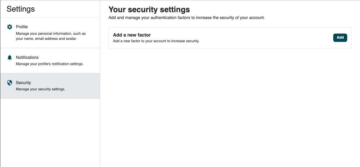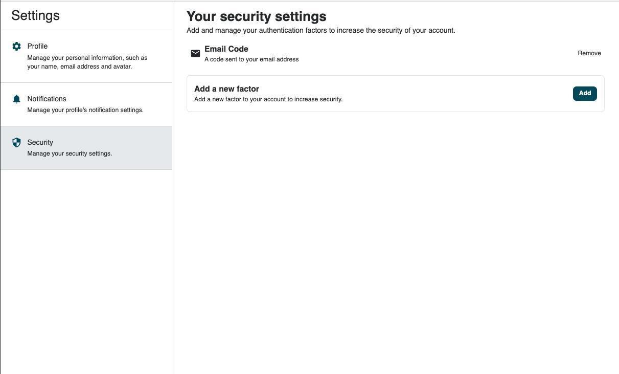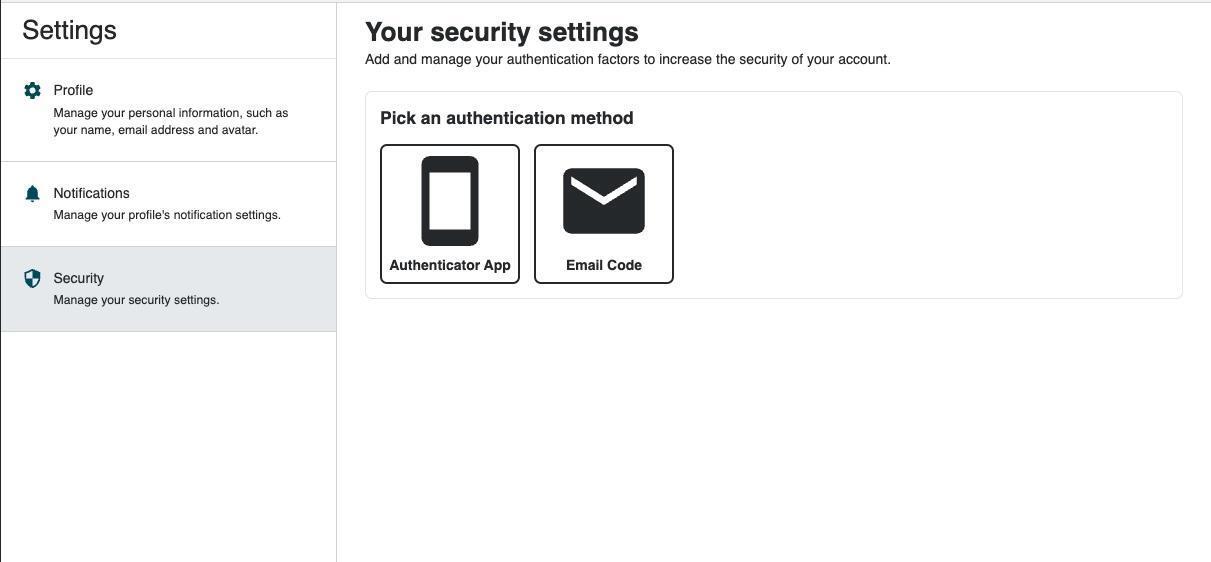 Under My Profile, users will have a new tab titled “Security.” From here, users can select an authentication method.