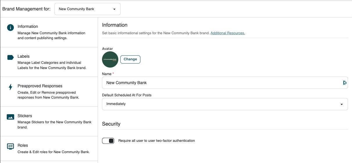 After 2FA has been enabled for the brand, there is a new toggle switch in the “Brand Information tab in Brand Management.