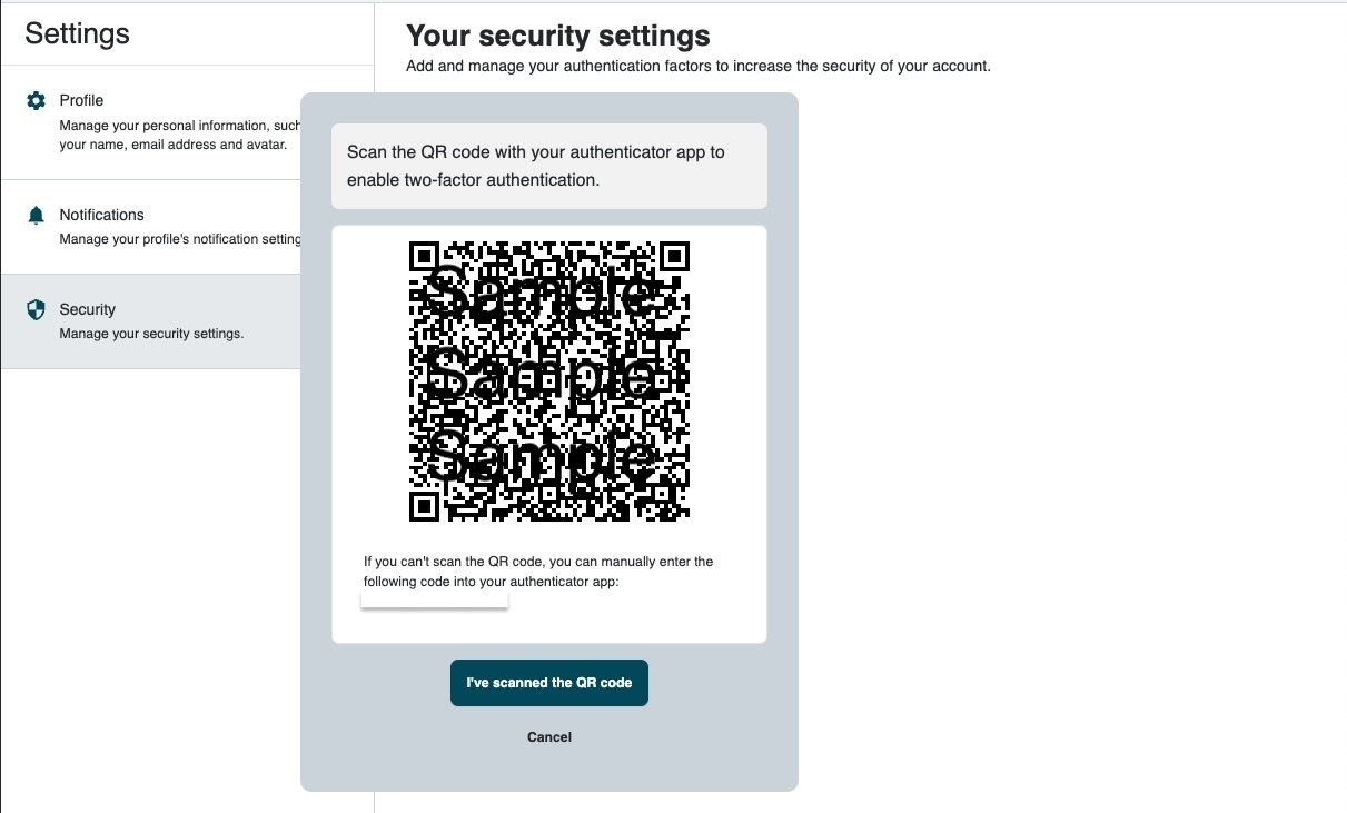 When selecting “Authenticator App,” users will receive a QR Code to scan. Users will scan this code in their authenticator app. If unable to scan, there is a code that can be entered.