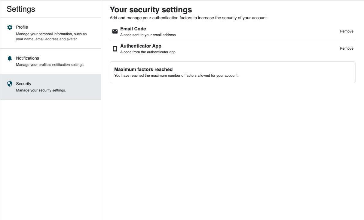 If both factors are added, users will receive a message saying “Maximum factors reached.”