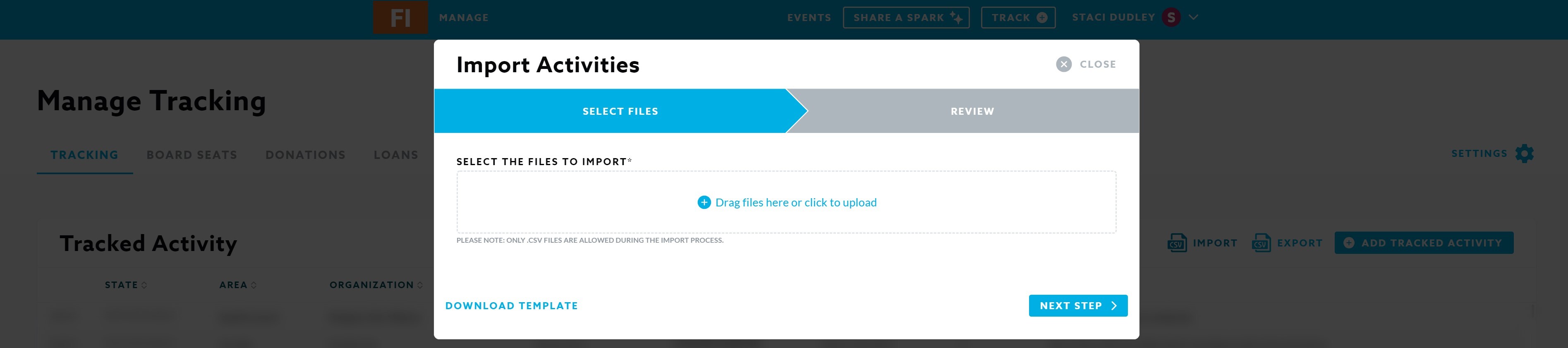 - Select the entity you would like to import the records to under the Manage area of Community Spark (Events, Tracking, Board Seats, Donations, Loans, Investments, Organizations) and click on Import to the right-hand side above the current records.