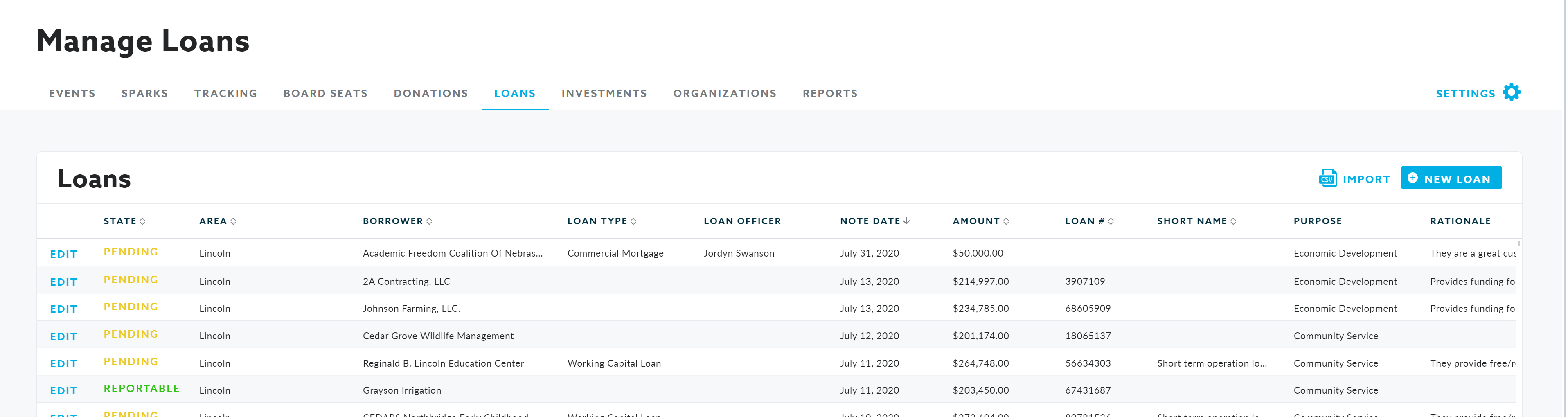 The Loans feature of Community Spark allows organizations to view all of their loan dollars made throughout the community.