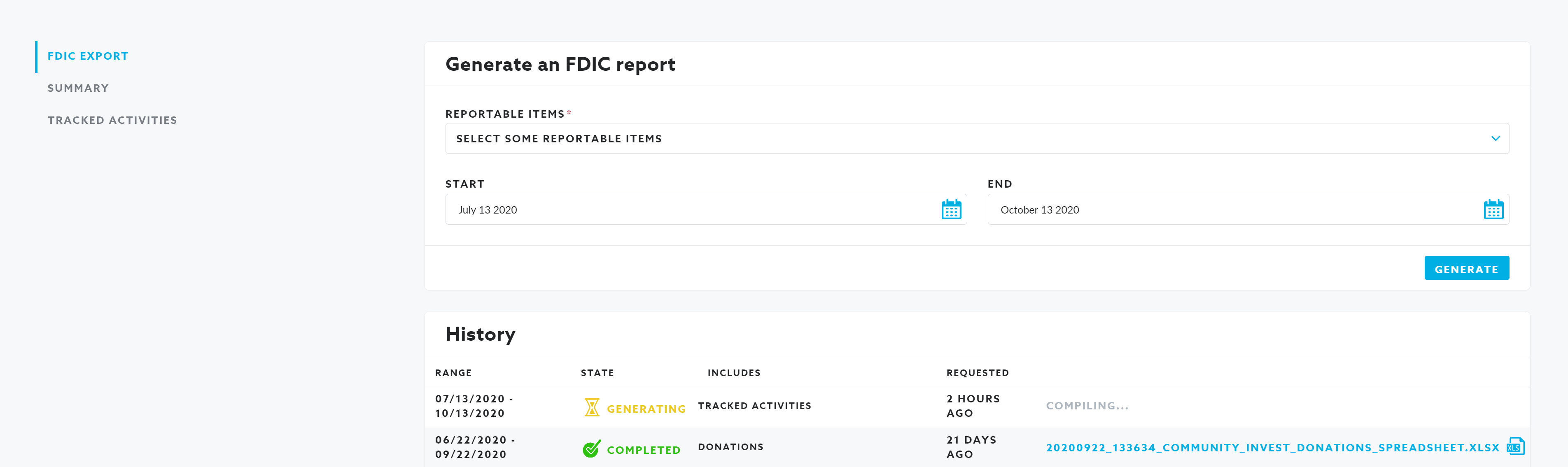 - Click on Generate. Once the report is prepared, it will be made available for download in the History area.