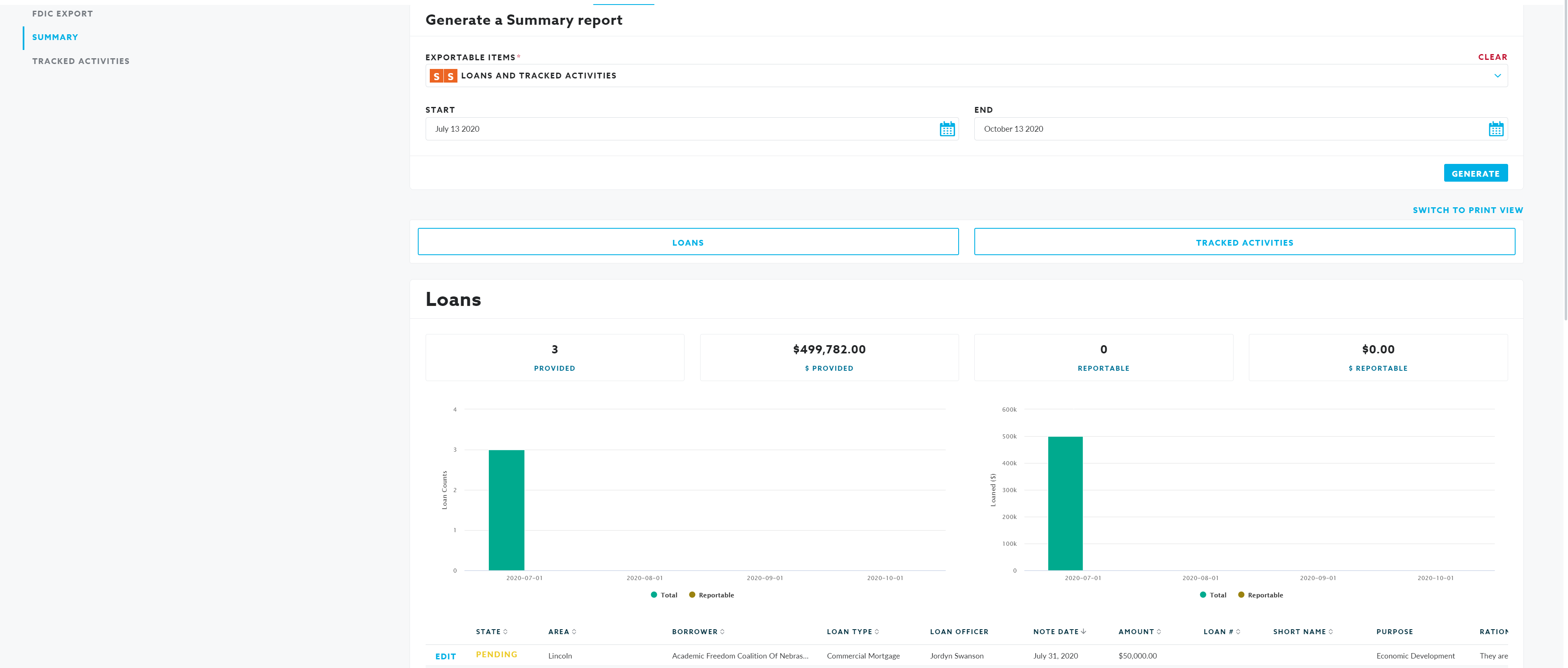 The Summary Report provides cumulative activity summaries for Loans, Investments, Donations and/or Tracked Activities. To compile a summary report: