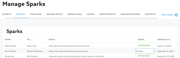 To approve a pending Spark, you can simply double click on the pending state (marked in yellow) which will allow you to approve, deny or leave the Spark as pending.