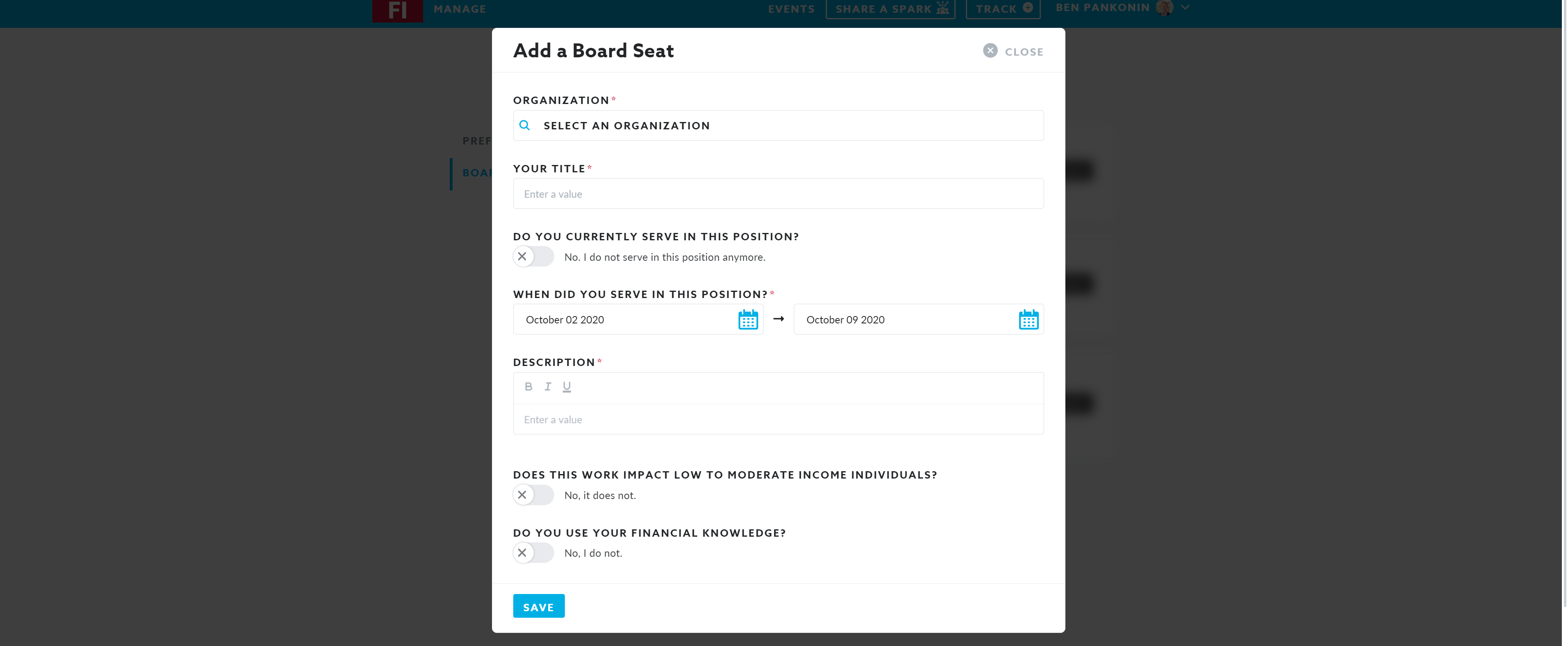 The board seat functionality of Community Spark allows employees to share their participation in community organizations through providing guidance on boards. This helps brands get a stronger picture of the impact their employees are making in the community. To notate your board participation in Community Spark: