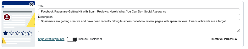 If you use the link shortener, you may click on the image to modify or replace it with a new one. You can also edit the title and description for Facebook. You also receive a toggle switch to enable/disable the link disclaimer. For more information on the link disclaimer, click here.