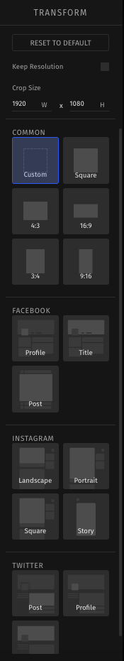 - Social - You can create platform-specific images by selecting cropping options for Facebook, Twitter, and Instagram.