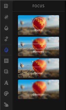 Add a cool blur enhancement to your image with the focus feature. There are four blur effects to choose from - Radial, Mirrored, Linear, and Gaussian.
