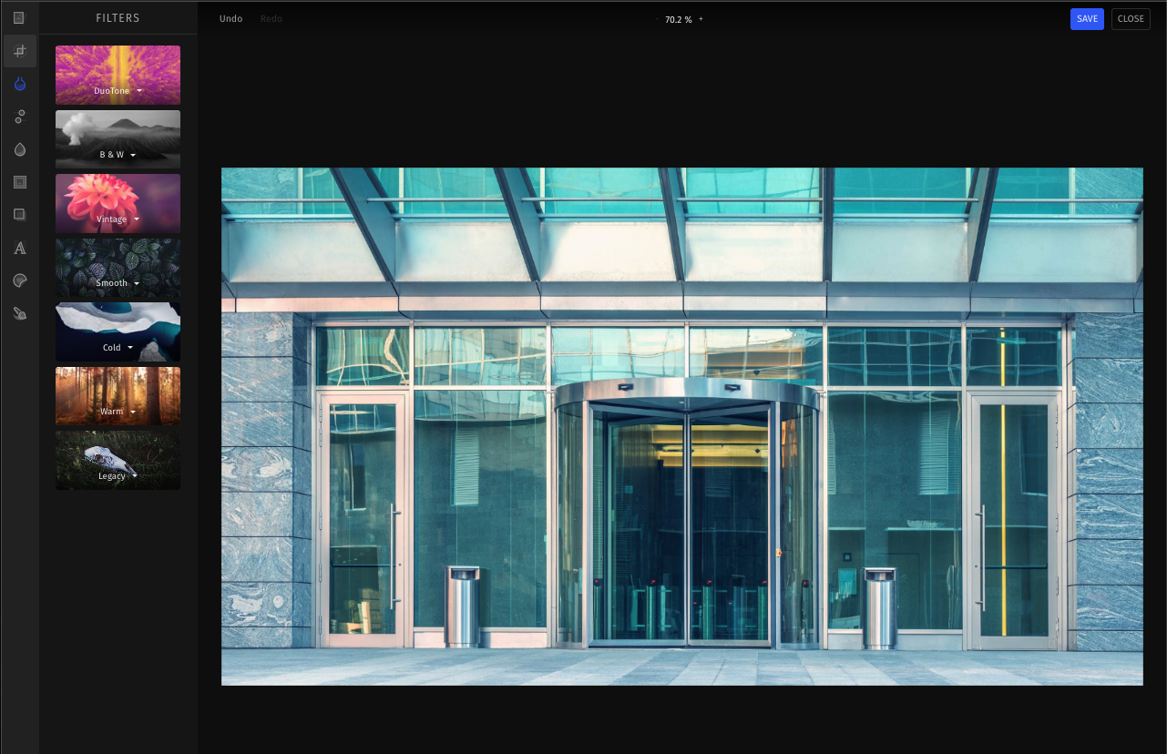 The filter feature allows you to provide colorized filters to the image. You can enhance or decrease the filter intensity by sliding the intensity bar above the filters to the left or right.